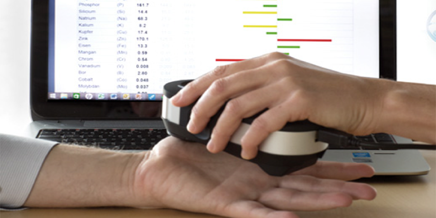 Das Messergebnis zeigt 21 Mineralien-und Spurenelemente, 15 Schwermetalle, 7 Vitamine und wichtige physiologische Zusammenhänge.